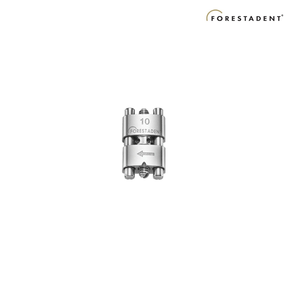 Surub disjunctie Anatomic Snap-Lock & Falling Apart fara brate Exp = 10 mm Rot = 0,9 mm - Surub de disjunctie pentru expansiune transversala a maxilei, fara brate, tehnologie "Snap-Lock" si "Falling apart". Suruburile Snap-Lock au un mecanism de protectie impotriva revenirii surubului. Doar medicul sau pacientul il pot intoarce. Dupa activarea surubului, placuta il blocheaza. Atunci cand surubul este activat corect pentru 1/4 tura, atat medicul cat si pacientul pot auzi si simti blocarea surubului. Gaura de la nivelul surubului este intotdeauna in pozitia corecta pentru activare. In cazul unei supra-activari, miscarea surubului Snap Lock poate fi reversibila.Expansiune max. 10 mm, cu pas de 0.9 mm. Dimensiune: 14.5 mm.