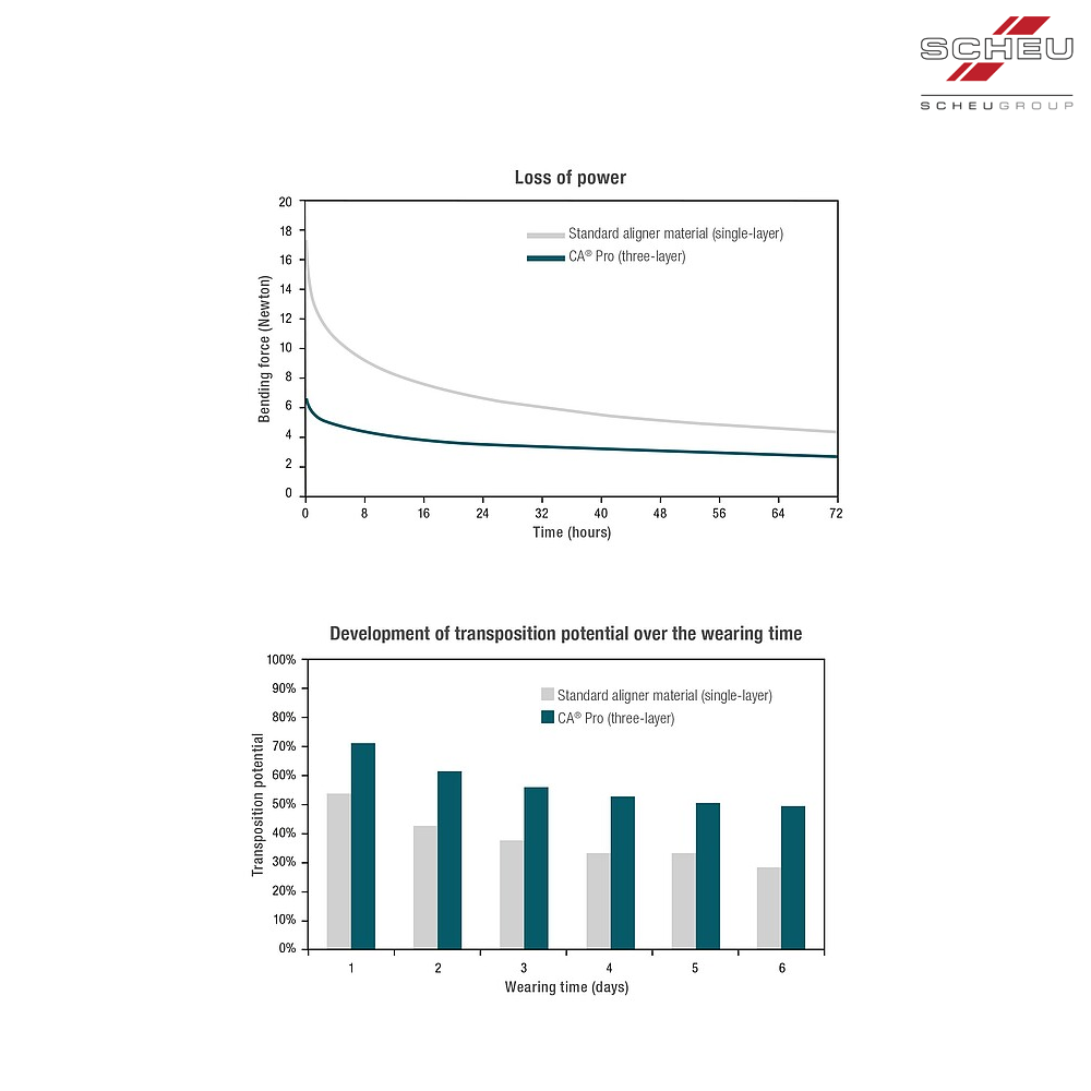 Folia CA Pro+ pentru alignere e formata din trei straturi cu miez elastomer flexibil intr-o carcasa dubla elastica, care este capabila sa mentina un nivel de forta constanta cu pierdere minima de forta. Stratul flexibil de elastomer asigura elasticitate ridicata si rezistenta la rupere, reducand in acelasi timp forta initiala si sporind confortul pacientului.