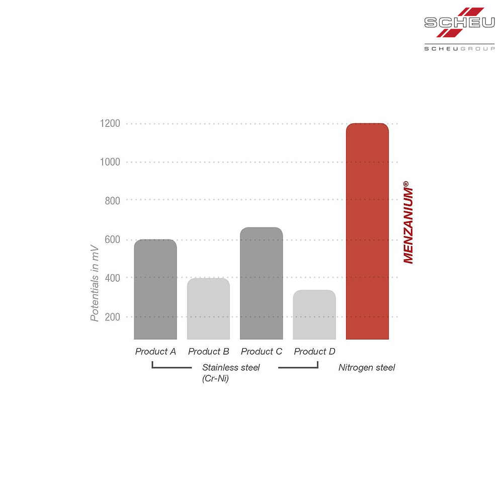 MENZANIUM este un aliaj de otel inoxidabil fara nichel, fabricat printr-un proces patentat de topire la presiune ridicata care inlocuieste nichelul alergen cu mangan si azot. Spre deosebire de aliajele traditionale de otel, rezistenta la coroziune si la rupere sunt imbunatatite. Disponibil in 2 variante: hard (1400-1600 N/mm²) si spring-hard (1800-2000 N/mm²).