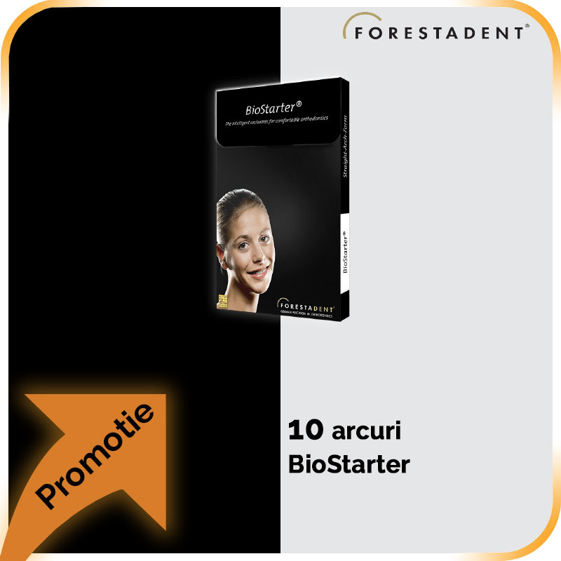 Cel mai mic arc BioStarter®, avand dimensiunea de 0.010“, extinde si mai mult gama de aplicatii ale arcurilor BioStarter®. Aceste arcuri pot lucra in cele mai dificile conditii. La pacientii compromisi parodontal si cu malocluzii, corectia se va realiza cu forte usoare, fara niciun risc si extrem de bland. Pana acum, pentru astfel de aplicatii se utilizau arcurile multifilament, dar care aveau forta mare de frictiune si elasticitate redusa, ceea ce ducea la extinderea perioadei de tratament.