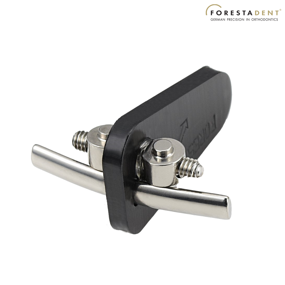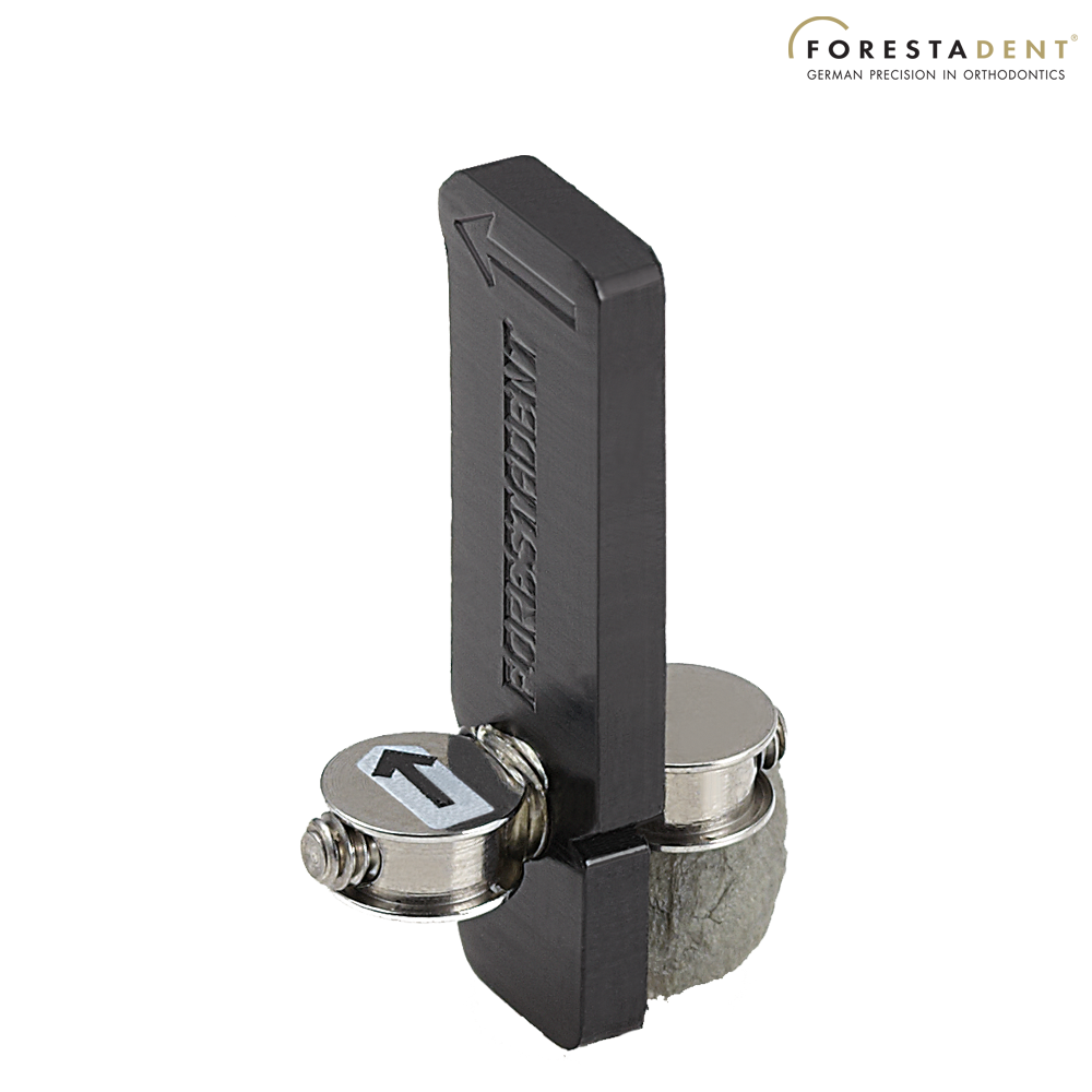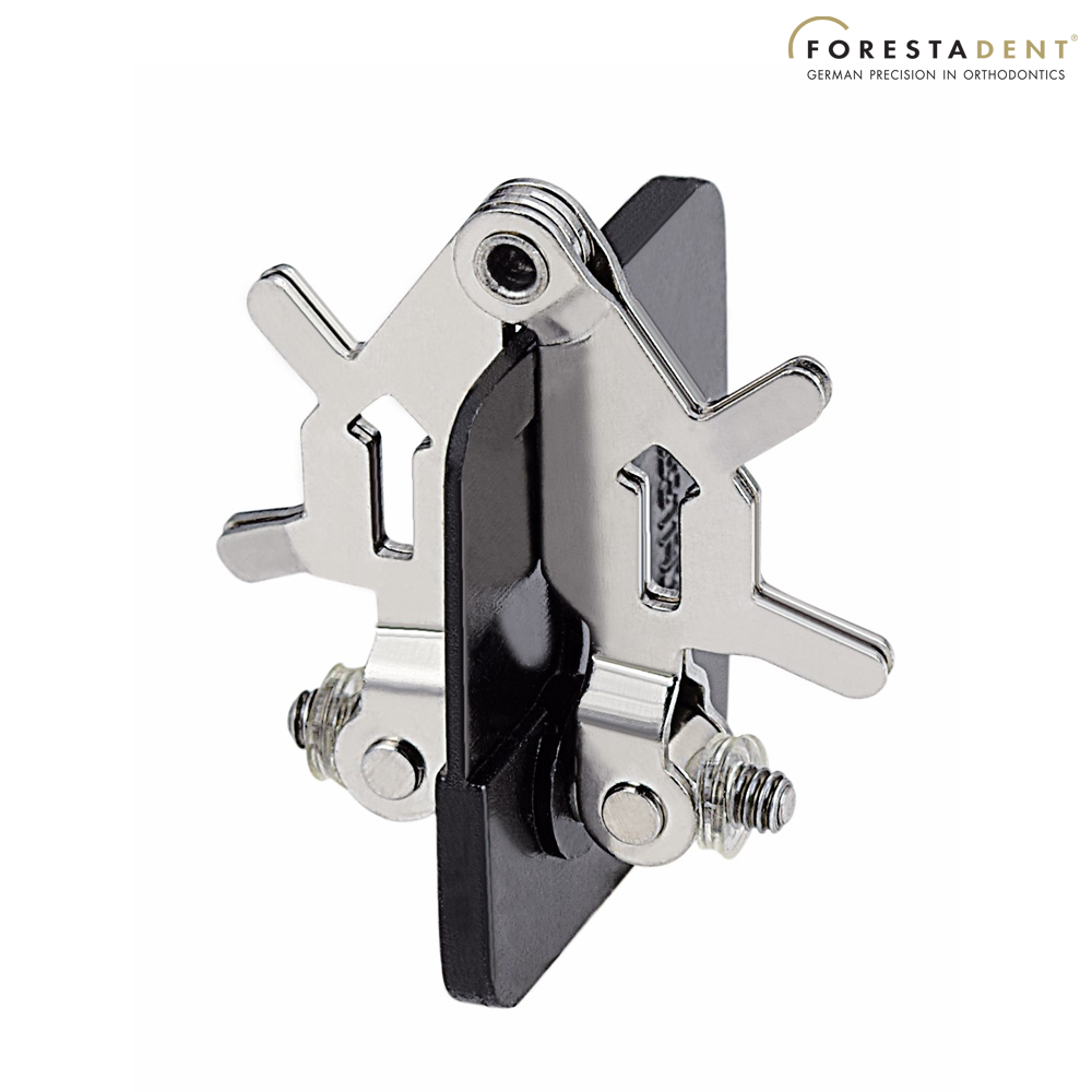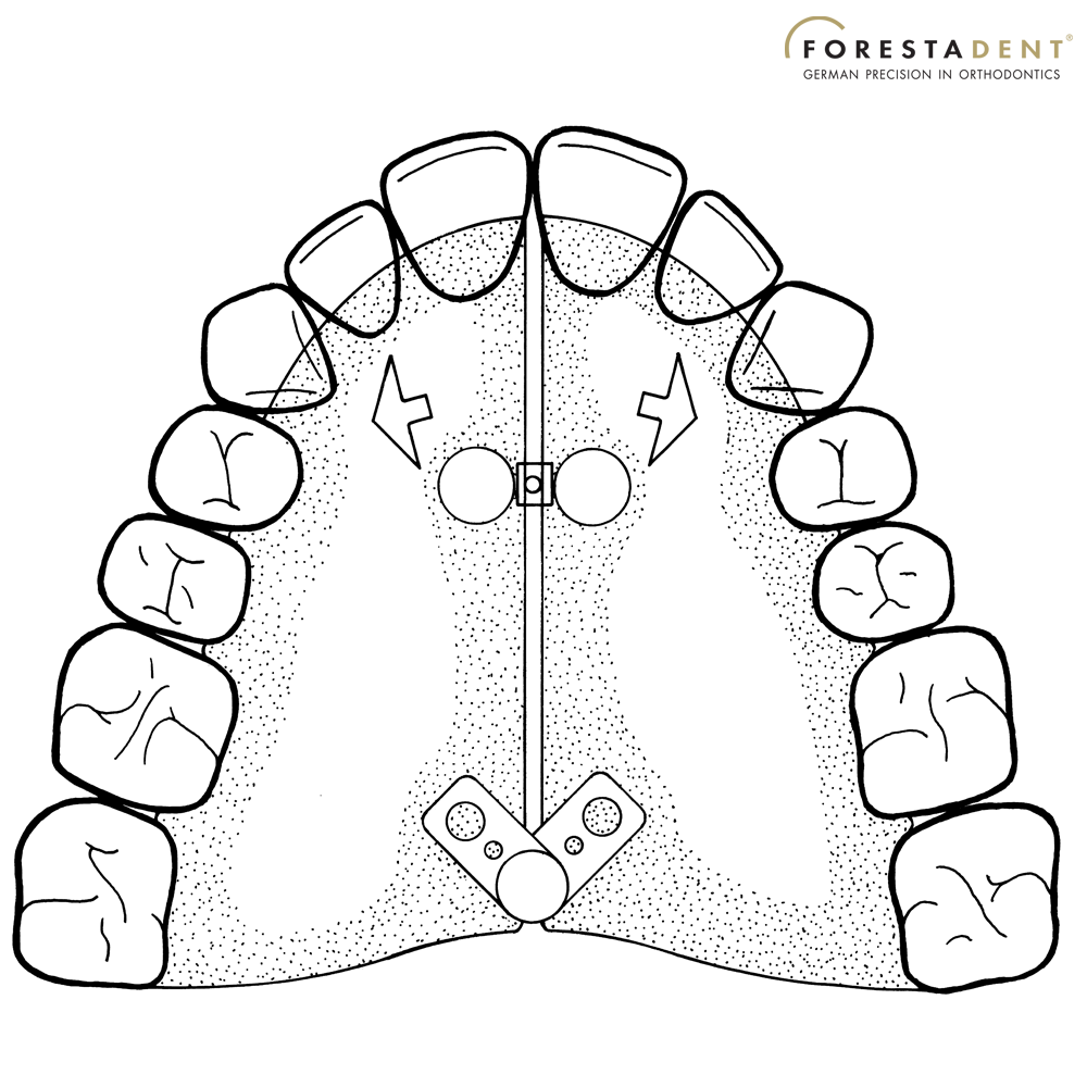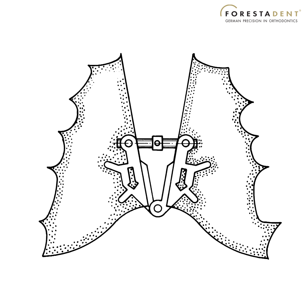 Surub tip evantai 2 componente Exp max 8 mm Rot 0,8 mm - Surub tip evantai pentru cresterea distantei intercanine. Balamaua si surubul sunt furnizate ca doua componente separate. Cele doua componente ale aparatului se deschid asemenea unui evantai. Balamaua tip eventai poate fi amplasata independent de surubul de expansiune. Expansiune max. 8 mm cu pas de 0.8 mm.